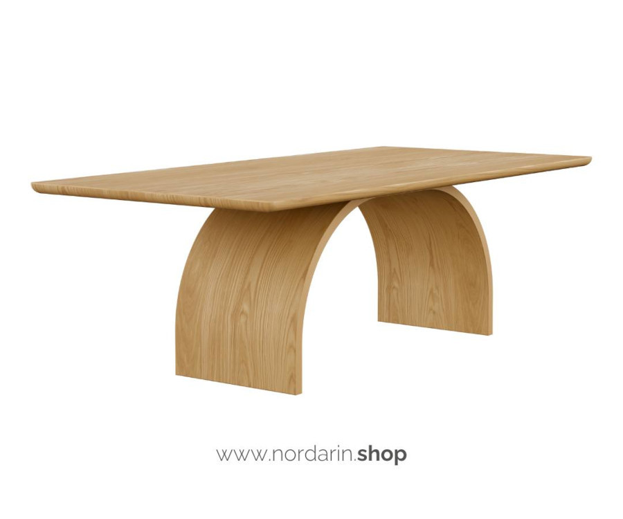 Masa Arc este o piesă din lemn de stejar cu o prezență masivă și stabilă, păstrând însă deplină libertate de mișcare în jurul său. Blatul dreptunghiular se sprijină pe un picior curbat, astfel că rezultă o piesă elegantă, modernă și clasică în același timp, în jurul căreia se poate sta comod. Are un design inovator, cum însăși echipa Nord Arin o spune, exprimând o uimitoare simplitate prin combinația a două forme geometrice aparent opuse.