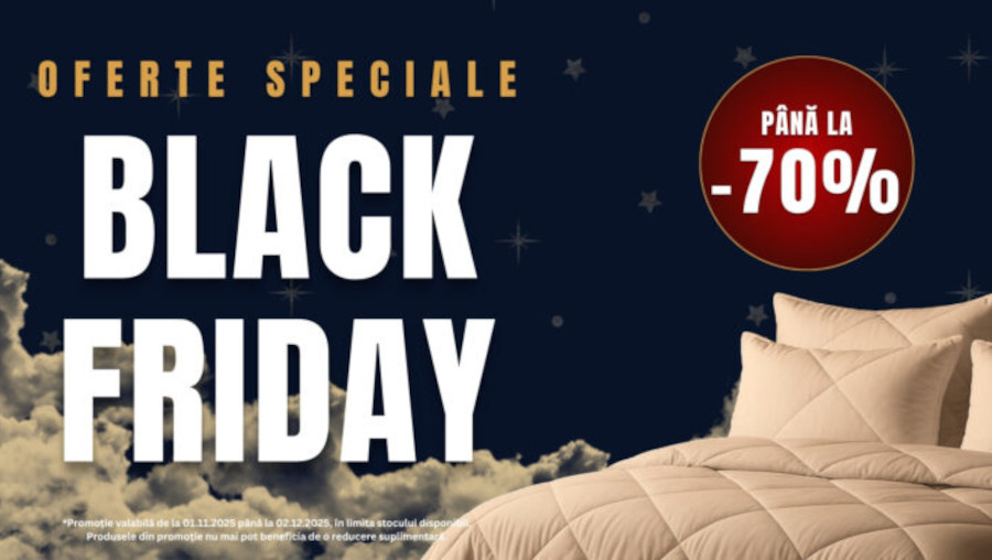 Dormeo dă startul reducerilor de Black Friday 2025 pe 4 noiembrie, venind cu procente foarte mari de ieftinire a gamei sale de produse. Cu până la 70% sunt prețurile mai mici, atât la gama de pilote și perne, cât și la gama de saltele. Practic, sunt înscrise în această campanie 61 de produse, de toate categoriile, de la toppere și protecție saltea, la pilote, pături, perne, saltele și aparate electrocasnice.