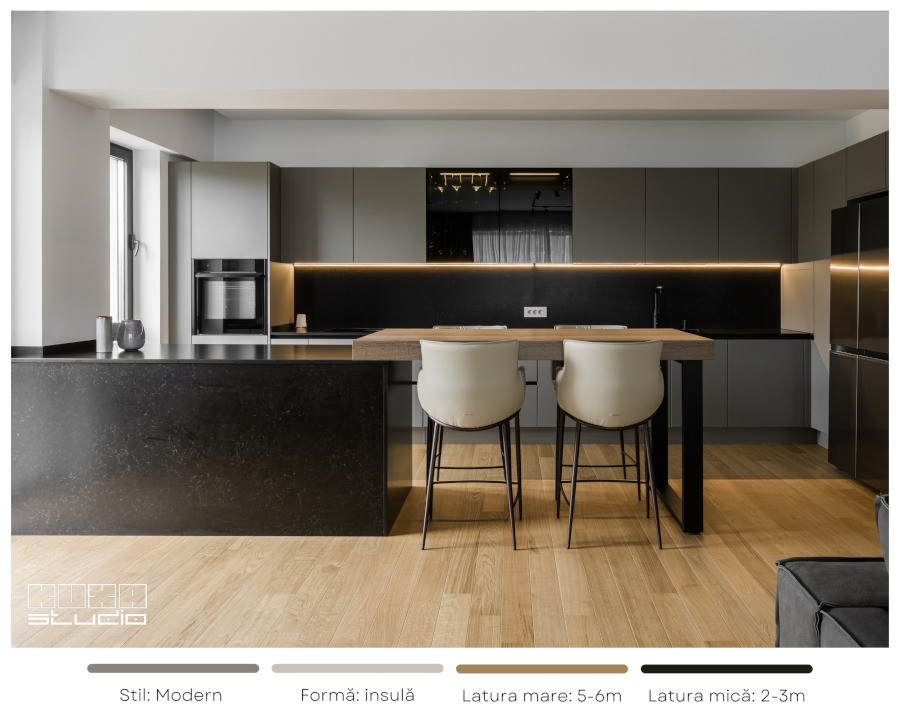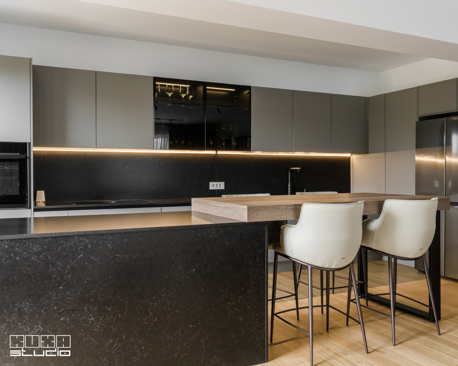 Între timp, Kuxa tocmai a lansat sub formă de proiect de amenajare un model de bucătărie dominat de o insulă spectaculoasă, combinând texturi și culori dintre cele mai rafinate: blat din cuarț de culoare neagră, fronturi mate în nuanțe gri, extensie de blat din lemn masiv cu finisaj natural luminos. Un punct forte al bucătăriilor Kuxa Studio îl reprezintă gama completă de electrocasnice și accesorii sanitare pe care le oferă spre vânzare, practic oferind un proiect la cheie.
