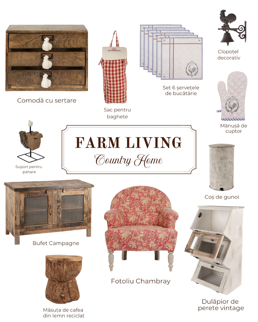 Mobilierul pentru casă de la Country Home provine de la producători cu experiență în stiluri de tipul country, farmhouse, vintage, industrial. O parte importantă a colecțiilor este adusă din India și din Indonezia, în urma participării echipei Country Home la târguri internaționale de profil. Și, în sfârșit, mai este și o categorie de piese produse de meșteșugari cu tradiție chiar în inima Transilvaniei. Caracteristicile acestor piese sunt design odihnitor și confortabil, personalitate, vârstă și rezistență în timp. Sunt realizate din materiale menite să treacă oricând testul timpului.