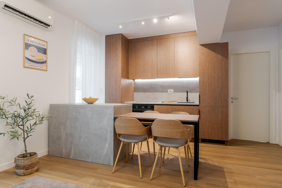 Dacă pentru insula de bucătărie puteai apela la produse pe stoc, gata fabricate, peninsula de bucătărie complică un pic lucrurile: presupune mobilier pe comandă, pentru a nimeri dimensiunile și forma potrivite cu bucătăria de acasă. În schimb, aduce un plus (de fapt, mai multe) în ce privește personalizarea.