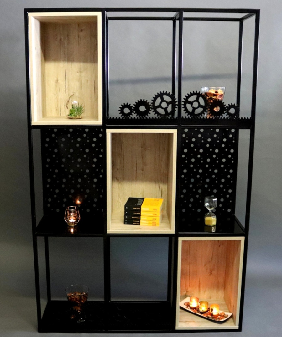 Biblioteca Wheels combină funcționalitatea unei astfel de piese cu un neașteptat grad de personalizare estetică. Înaltă de 120 cm, biblioteca dispune de 9 spații pentru depozitare, dar diferite ca design. Unele sunt „umplute” cu cutii tip ramă din mdf imitând prezența lemnului, altele sunt prevăzute cu elemente decorative în formă de rulmenți metalici și, în sfârșit, unele dintre aceste spații au spatele închis cu ajutorul tablei model oxigen cu diverse tipuri de găuri. Este o piesă pe care clientul o poate folosi în diverse locuri ale locuinței, fie pentru cărți, sistem audio-video sau dulap office.