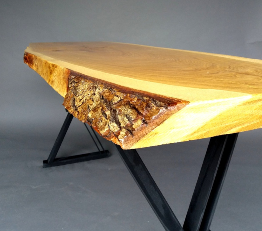 Pentru zona de dining, la Metal Creativ a fost creată o masă lungă din blat de stejar prelucrat într-o formă cât mai brută. Blatul din lemn te introduce direct în atmosfera unei cabane de munte, prin expunerea fibrei și prin păstrarea marginilor acoperite parțial de scoarță. Picioarele sunt din profil metal negru, model de forma literei X, dând mesei o notă contemporană și totuși atemporală.