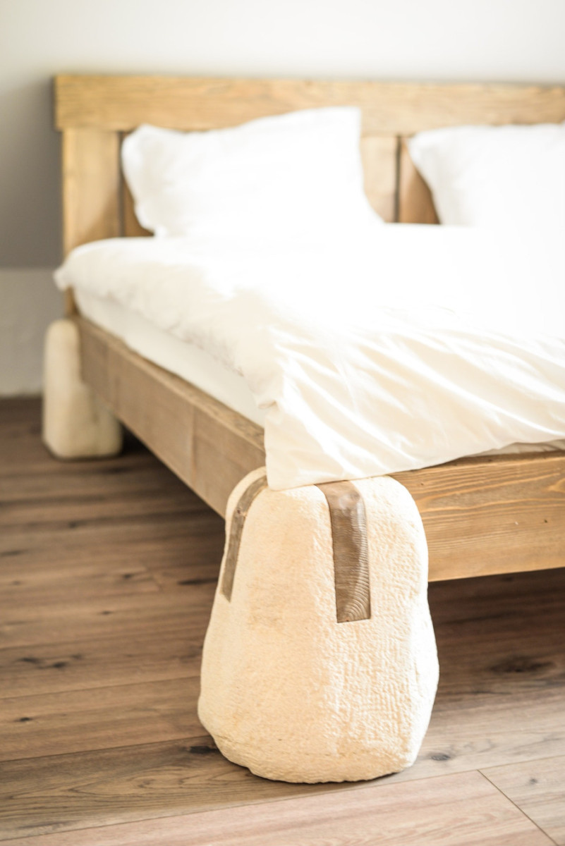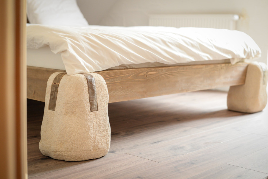 Denumit Marian, patul a fost realizat în mai mult de un exemplar, fiind vizibile diferențele la nivelul… pietrelor, fapt perfect explicabil întrucât nu poți găsi două pietre la fel pe lume. Se păstrează însă forma rotunjită și baza stabilă, fiecare picior prezentând diferențe la același pat, nu doar la paturi diferite. De asemenea, nivelul de șlefuire a suprafeței pietrei diferă de la un exemplar la altul. Ceea ce rămâne la fel de admirabil la toate aceste picioare de pat este felul în care cadrul de lemn se așază în tăietura pietrei – armonios, cursiv, parcă natural. Picioarele de la capătul patului sunt în plus decorate cu fâșii de lemn care par să „peticească” locul în care piatra a fost decupată pentru a permite inserarea cadrului de lemn.