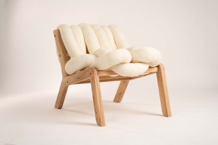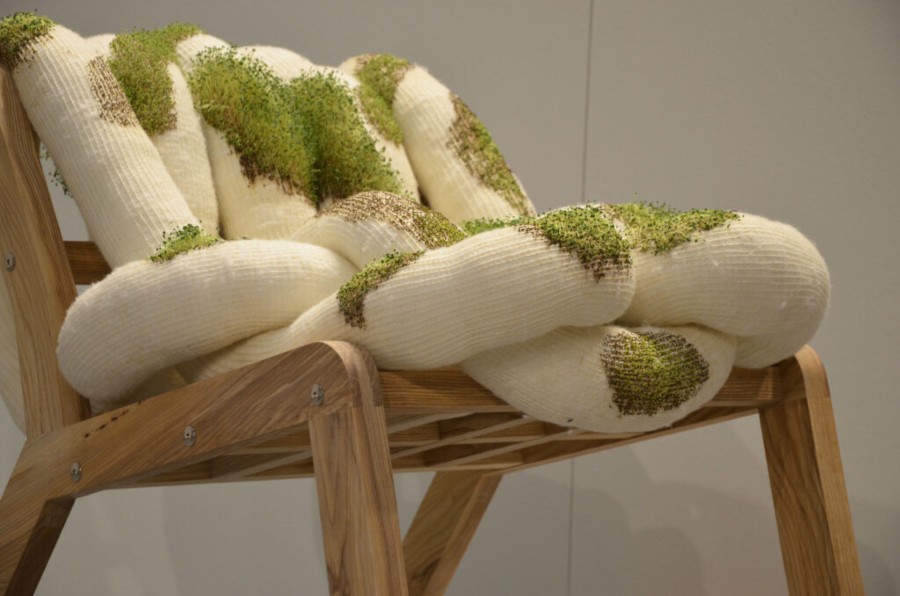 Scaunul Chia arată destul de obișnuit, doar că pe el nu se așază oamenii, ci… plantele. În timp, se transformă într-o piesă verde la propriu care să se integreze categoriei de mobilier viu. Cum arată? Structura este realizată din lemn și are un design ce inspiră ideea de fotoliu sau de mic șezlong. În loc de perne pentru șezut și spătar, i s-a atașat o tapițerie tip tub, ca un soi de șosetă din lână, umplută din plin cu poliester. Iar pe suprafața acestui tub au fost plantate semințe de chia.