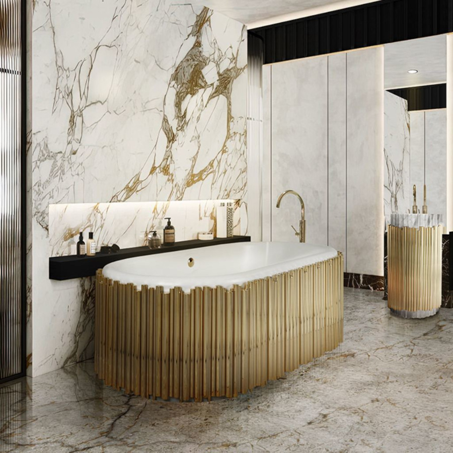 Tonuri metalice prețioase pentru accesoriile tradiționale ale băii: baterii de chiuvetă și duș în finisaj lucios imitând bronzul, aurul sau sclipirea bulelor de șampanie. Pentru restul băii, predomină materialele cât mai naturale și sustenabile de la mobilierul din lemn masiv până la marmură și piatră naturală.