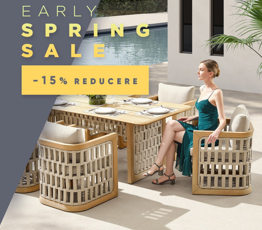 Prima veste de la Aplux se referă la o serie de piese de mobilă și accesorii outdoor, disponibile la prețuri mai mici ca-n restul anului. Este vorba despre campania Early Spring Sale care implică costuri cu 15% mai mici, plus montaj inclus, livrare la data aleasă de client și chiar depozitare gratuită până la momentul livrării. În această campanie sunt incluse mai degrabă seturi de mobilier outdoor, de la cele mari de tipul canapele, fotolii și mese până la seturi reduse precum șezlong cu măsuță de cafea. Oferta este extraordinar de variată, punând la dispoziția celor interesați o gamă foarte mare de produse.