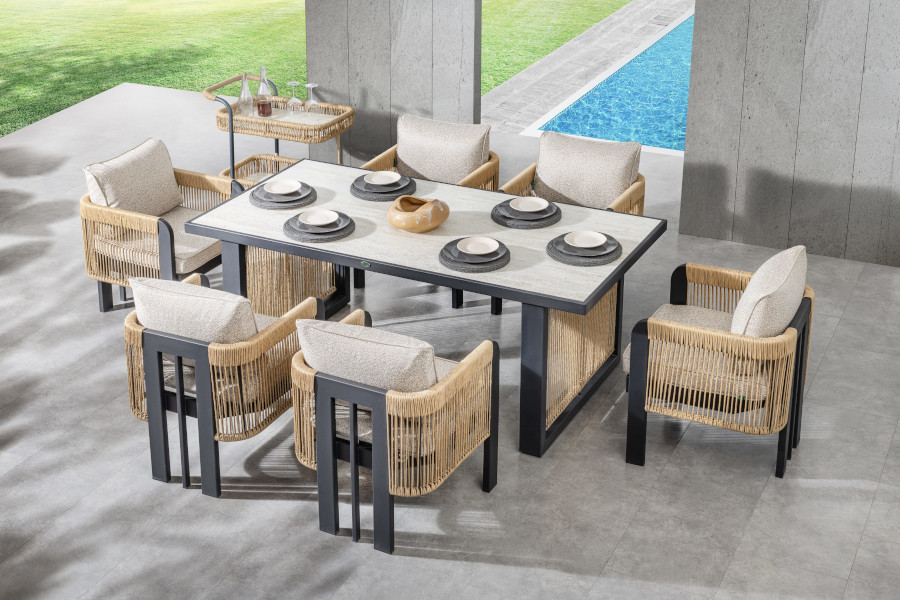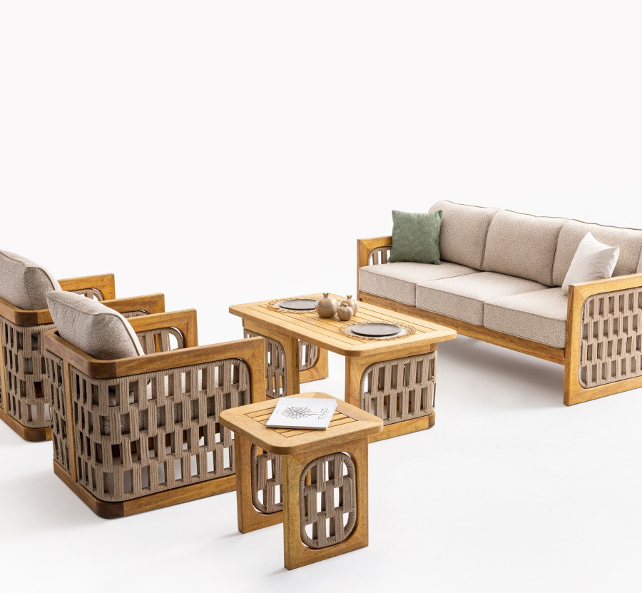 Setul dinning conține șase scaune și o masă generoasă, special pentru mese sau petreceri în aer liber. Setul Premium cuprinde fotolii, o canapea de trei locuri și o măsuță de cafea la care se adaugă și o măsuță tip taburet sau măsuță laterală. Măsuța de cafea atrage privirile în mod deosebit prin modul în care elementul de împletitură devine picior și bază de rezistență, respectând ideea de rotunjime în colțuri.