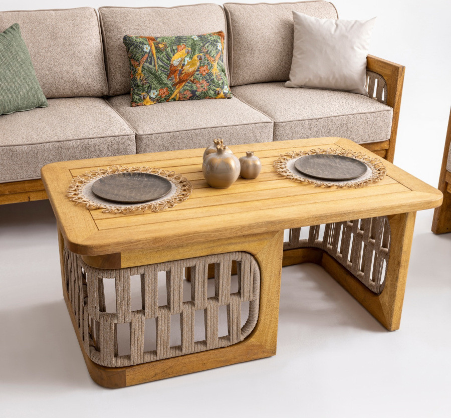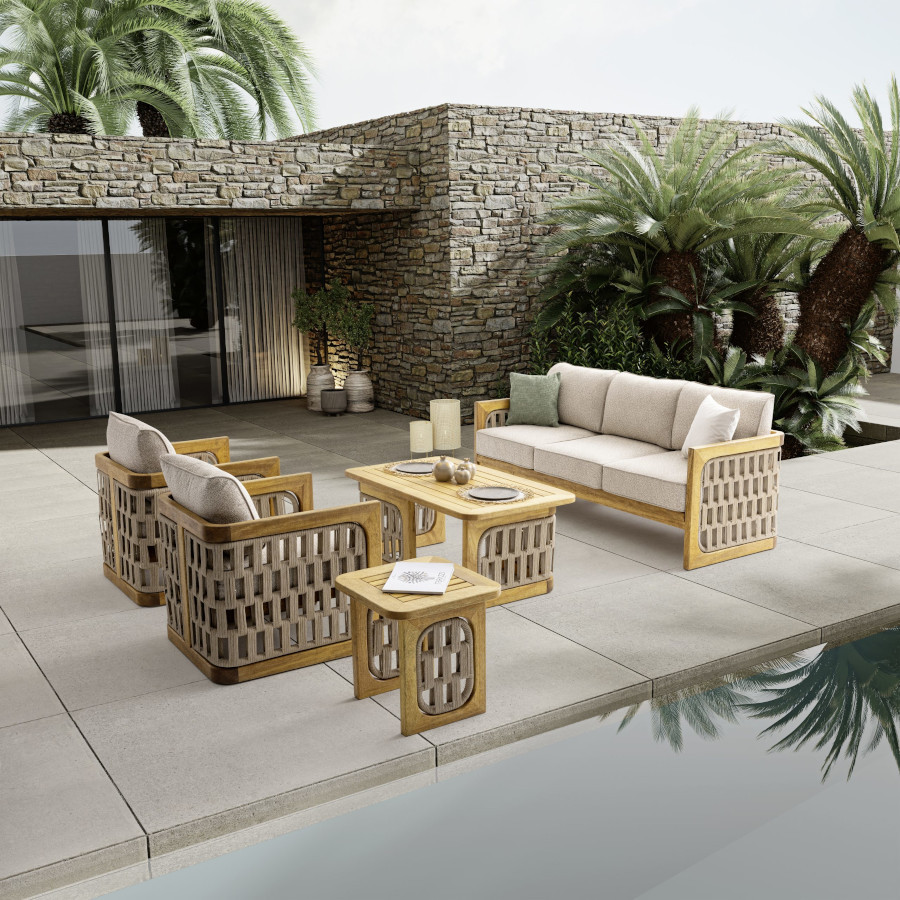 Designul rotunjit la nivelul împletiturii ce amintește de clasicele mobile din ratan. Împletitura este însă realizată din materiale rezistente și impermeabile, în timp ce structura este din lemn masiv. Atât la nivelul scaunelor, cât și al canapelei setul te duce cu gândul la confort, intimitate, asemenea unor îmbrățișări, efect obținut însă prin combinarea a două forme geometrice.