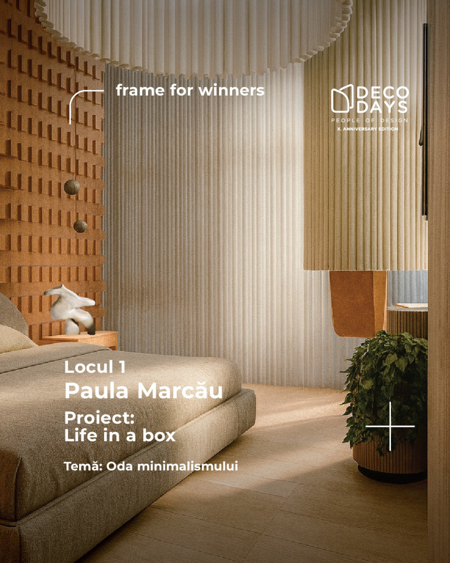Locul 1: Paula Marcău, cu proiectul Life in a Box, pornind de la subiectul Odă minimalismului – o amenajare inspirată de nevoia de regăsire a sinelui la interiorul spațiului individual. Compusă din piese de mobilier și accesorii relativ puține la număr, Life in a Box creează un interior scăldat în lumină naturală și artificială armonios îmbinate într-o paletă de nuanțe cărămizii cu efect calmant și intim. Este vorba de un dormitor dominat de dimensiunea patului și de motivul riflajelor redate până și la nivelul perdelei realizate din fâșii precum firele de ploaie. Restul mobilierului asigură funcționalitate deplină, dar prin design discret și rotunjimi cu efect de liniște.