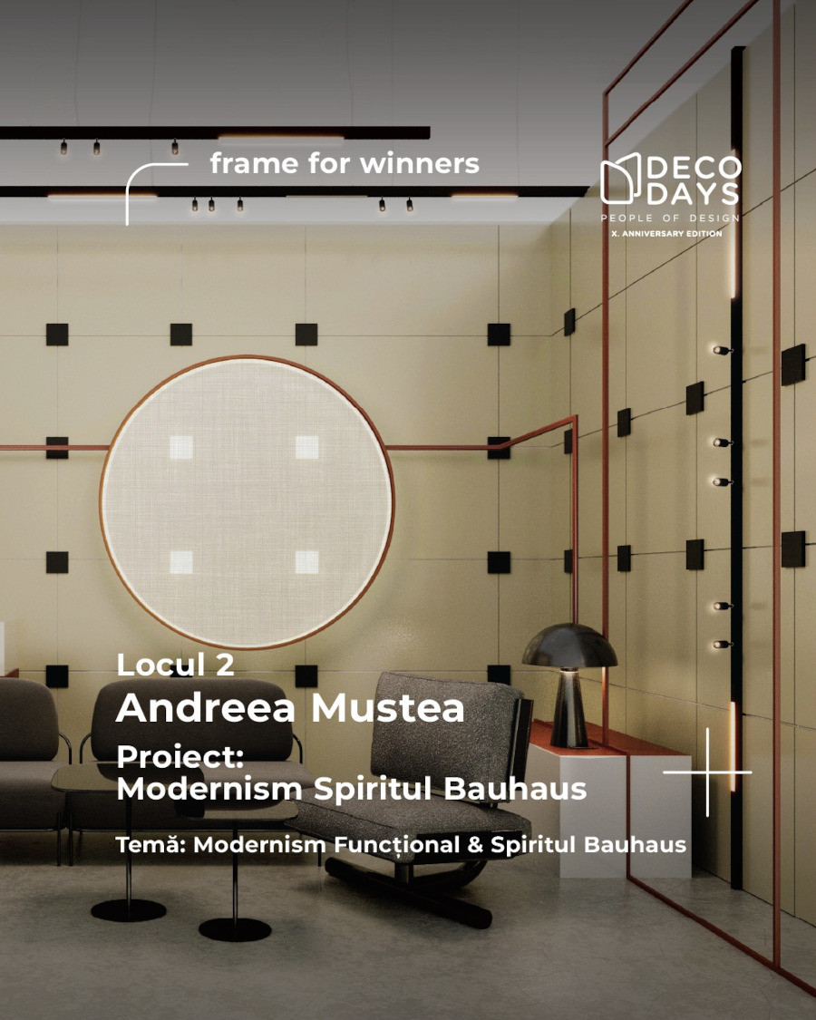 Locul 2: Andreea Mustea, cu proiectul Modernism spiritual, în cadrul temei Modernism funcțional Bauhaus. Este un proiect plin de viață și energie, implicând culori îndrăznețe dar combinate în așa fel încât duc la un efect armonios, de confort estetic – negru, roșu, galben. De această dată, formele geometrice și mai ales unghiurile drepte sunt în centrul atenției, turnate în materiale moderne de tip metalic. Este un spațiu care folosește din plin piese de mobilier și accesorii, dar în așa fel încât să exprime funcționalitate, libertate, masculinitate.