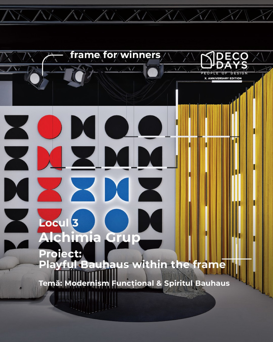 Locul 3: Alchimia Grup, cu proiectul Playful Bauhaus within the Frame, caracterizat de folosirea unei palete cromatice bogate: alb, negru, roșu, galben și albastru. Piesele de mobilier – canapeaua joasă, prevăzută cu margini rotunjite, respectiv măsuța de cafea neagră de formă dreptunghiulară – ies și mai bine în evidență prin dispunerea lor în fața unui joc al culorilor și funcționalității: un perete modular și draperii tip jaluzea. Efectul este de amenajare arhitecturală, un spațiu pe care să-l descoperi pe măsură ce-l și folosești la modul practic.